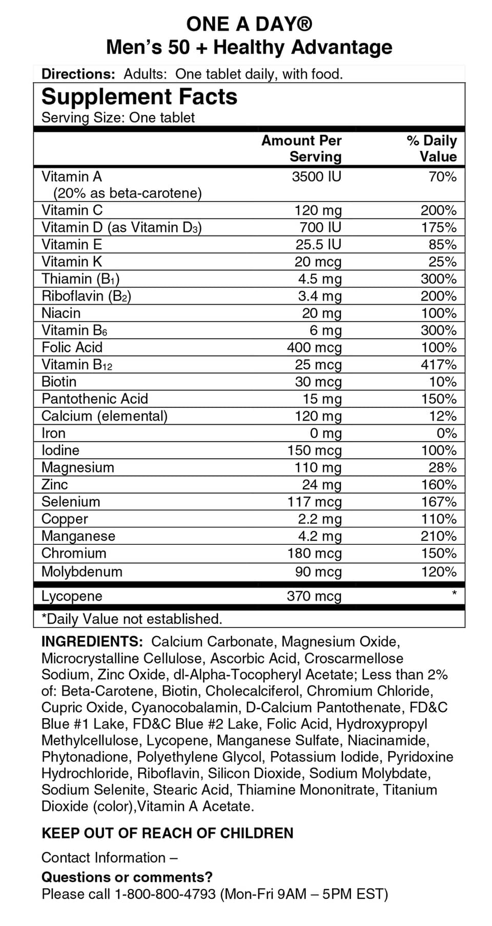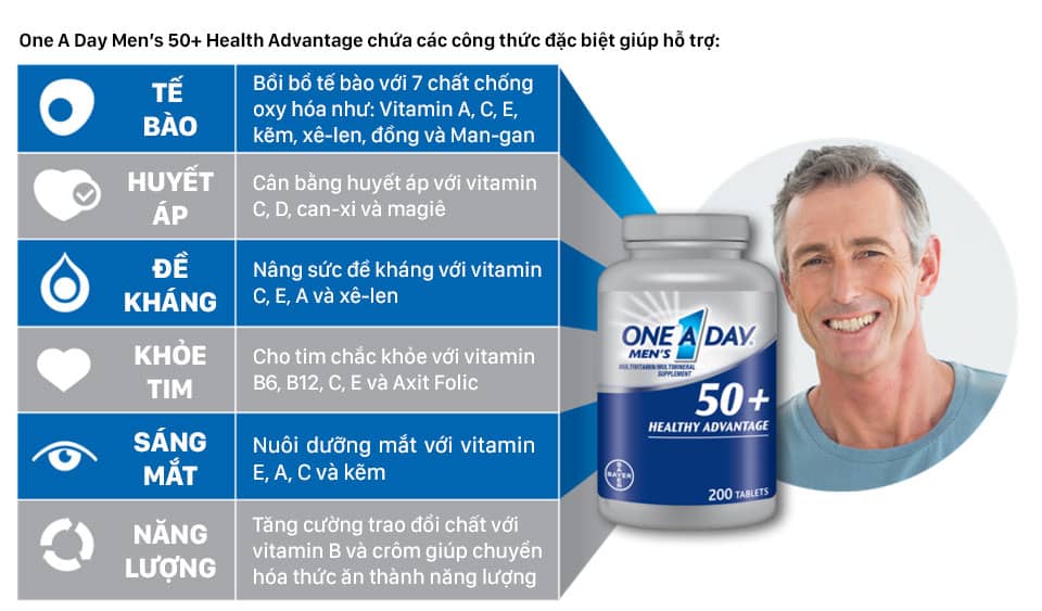Đối với nam giới độ tuổi trên 50 chủ động về sức khỏe của mình và đang tìm kiếm một viên đa vitamin dành riêng cho giới tính để giúp giải quyết các mối quan tâm cụ thể. Từ một công ty với nhiều năm chuyên môn về khoa học trong việc cung cấp vitamin tổng hợp chất lượng để hỗ trợ dinh dưỡng. Mong đợi một công ty với nhiều năm kinh nghiệm khoa học để cung cấp One A Day Men’s 50+ với đầy đủ vitamin tổng hợp chất lượng để hỗ trợ dinh dưỡng.